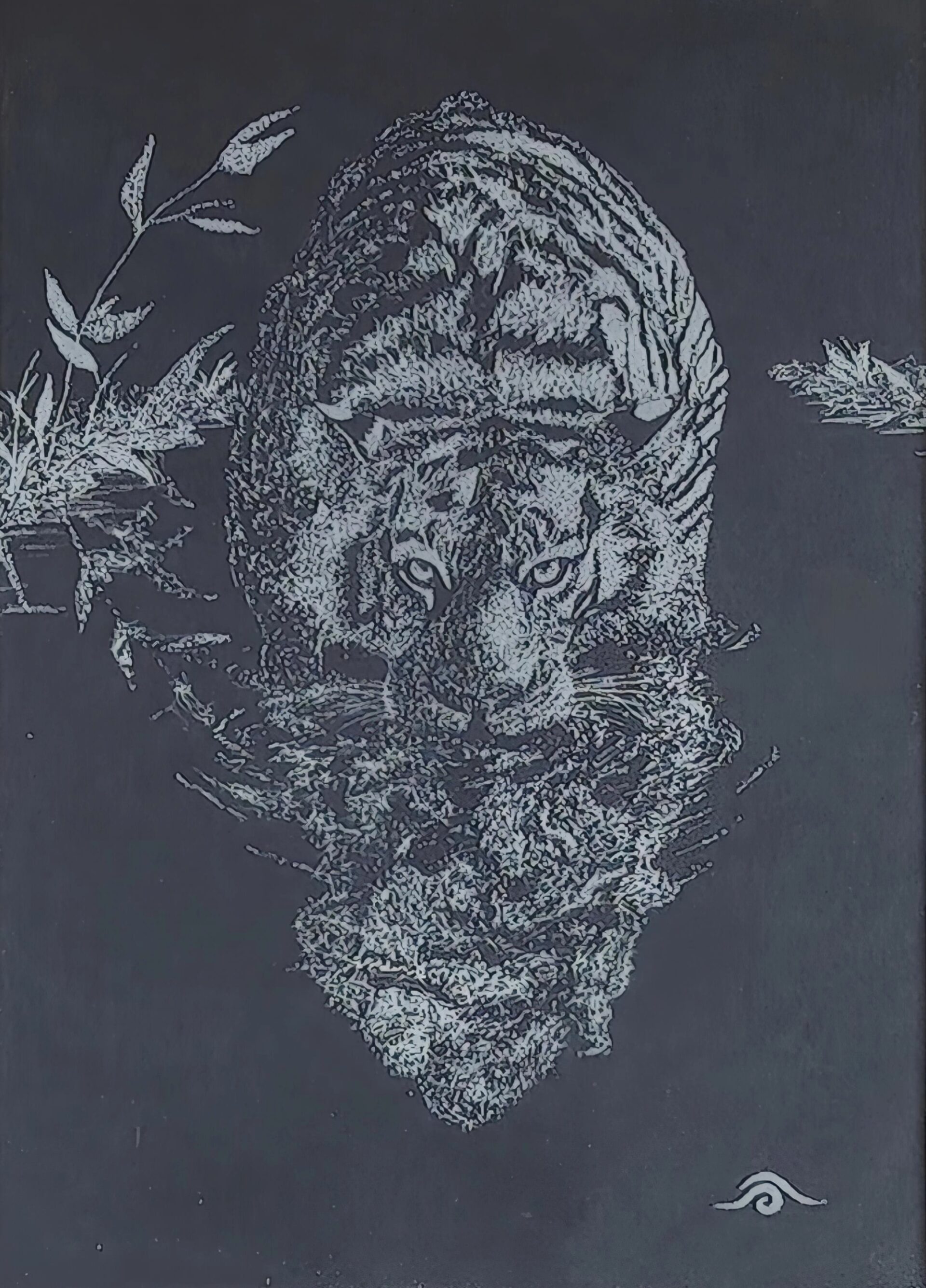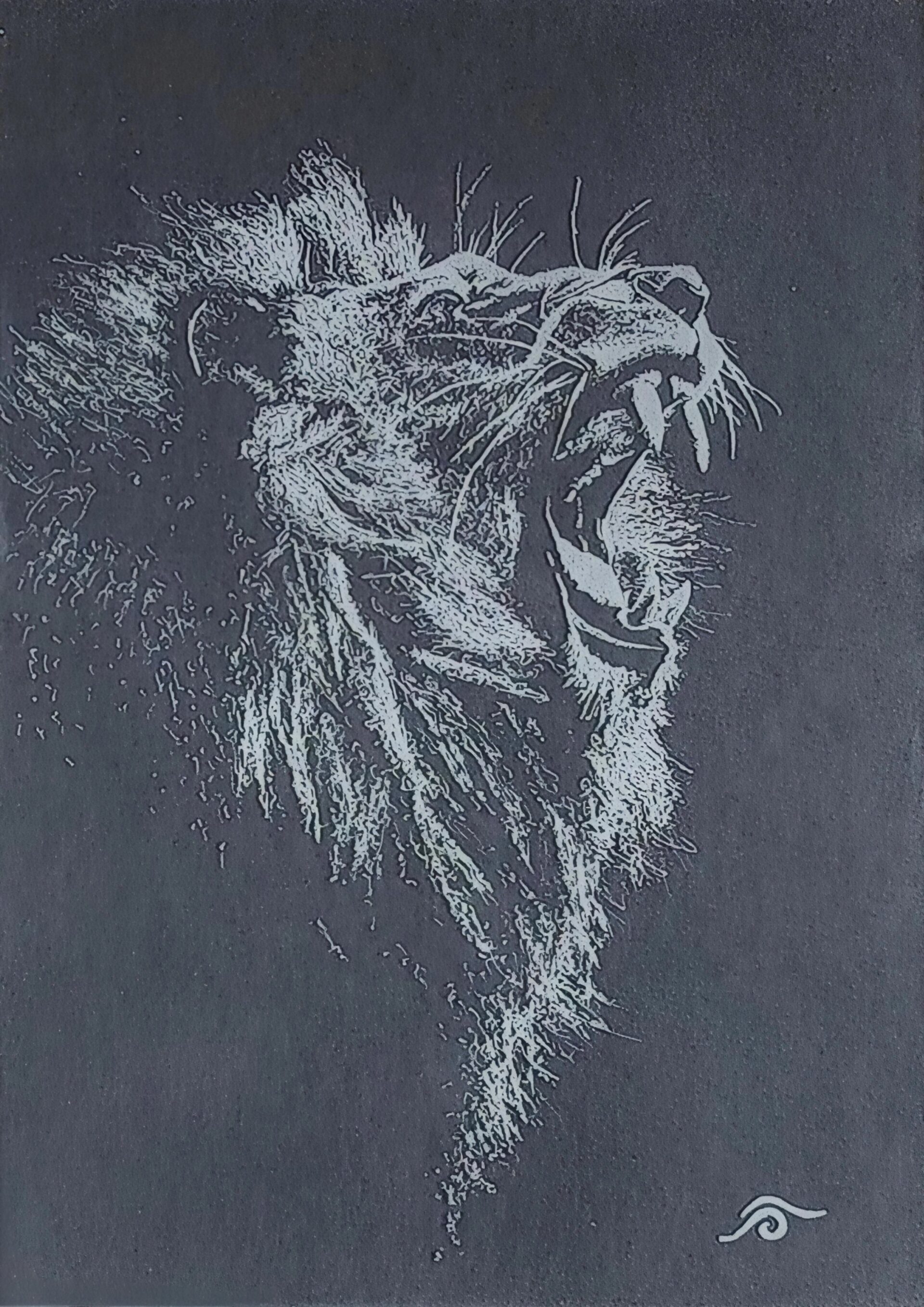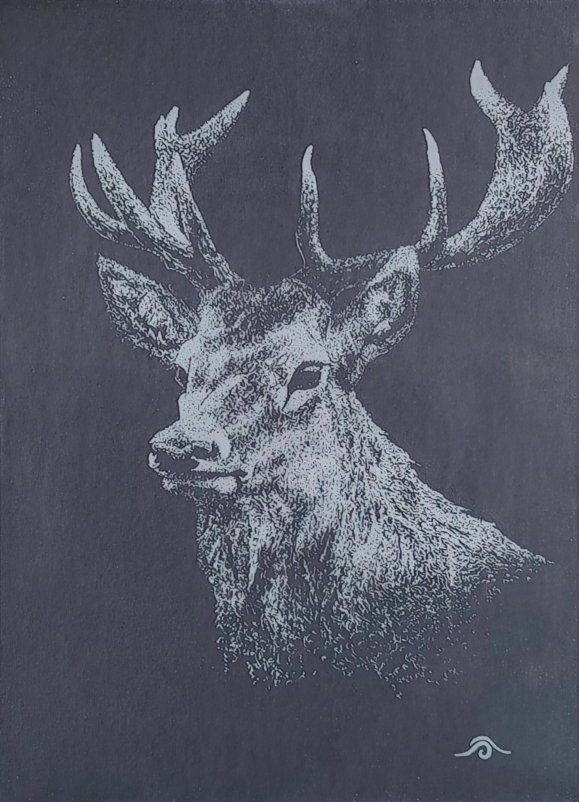 Avec une Dremel dans le tiroir, une envie soudaine me vient de la prendre en main et de graver le verre d’un cadre. Un cadre sous lequel je met un papier noir pour gagner un maximum de contraste. Pour pouvoir bien marquer et faire ressortir les valeurs, j’adopte le pointillisme en prenant ma plus grande patience pour graver chacun de ces points.