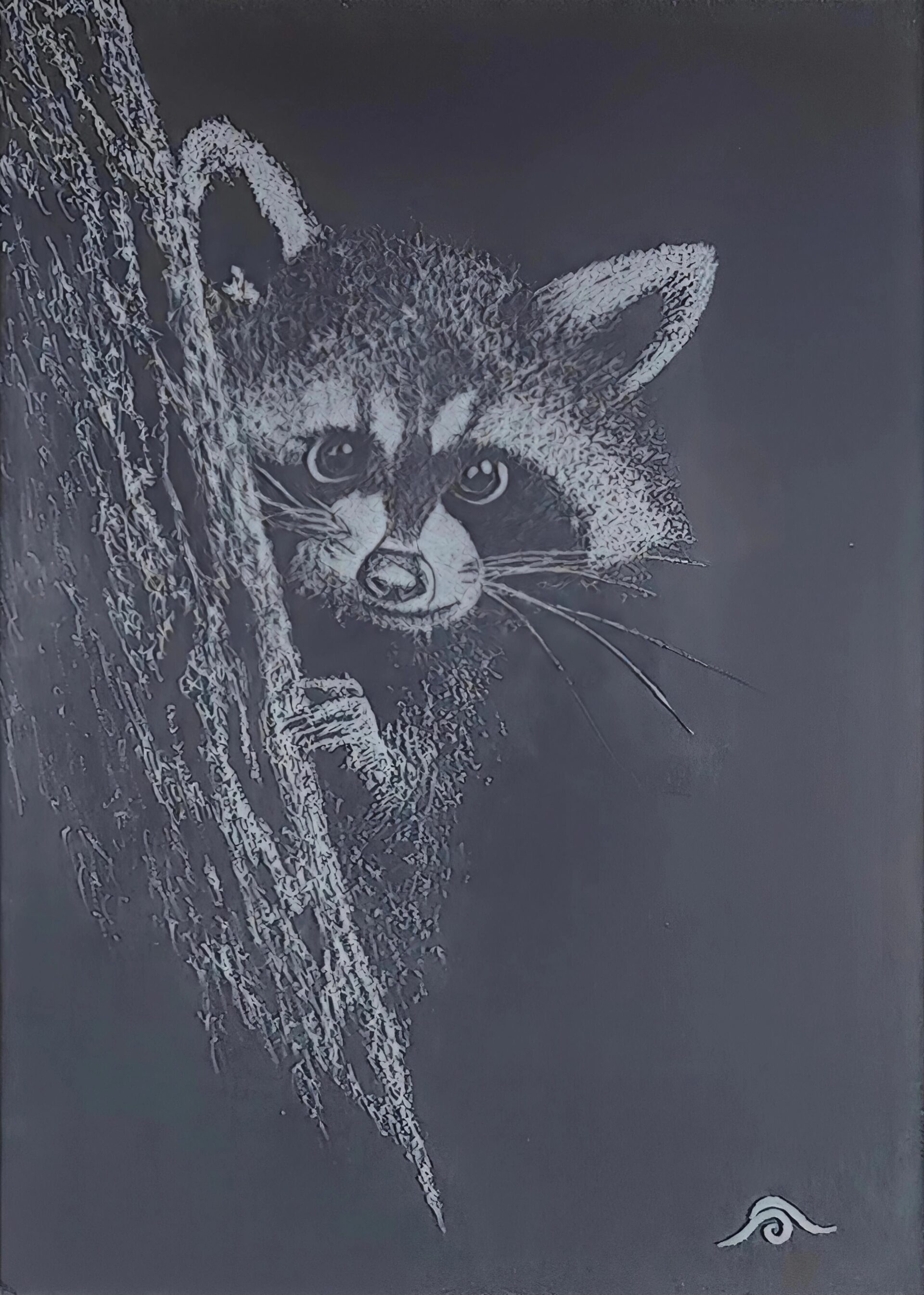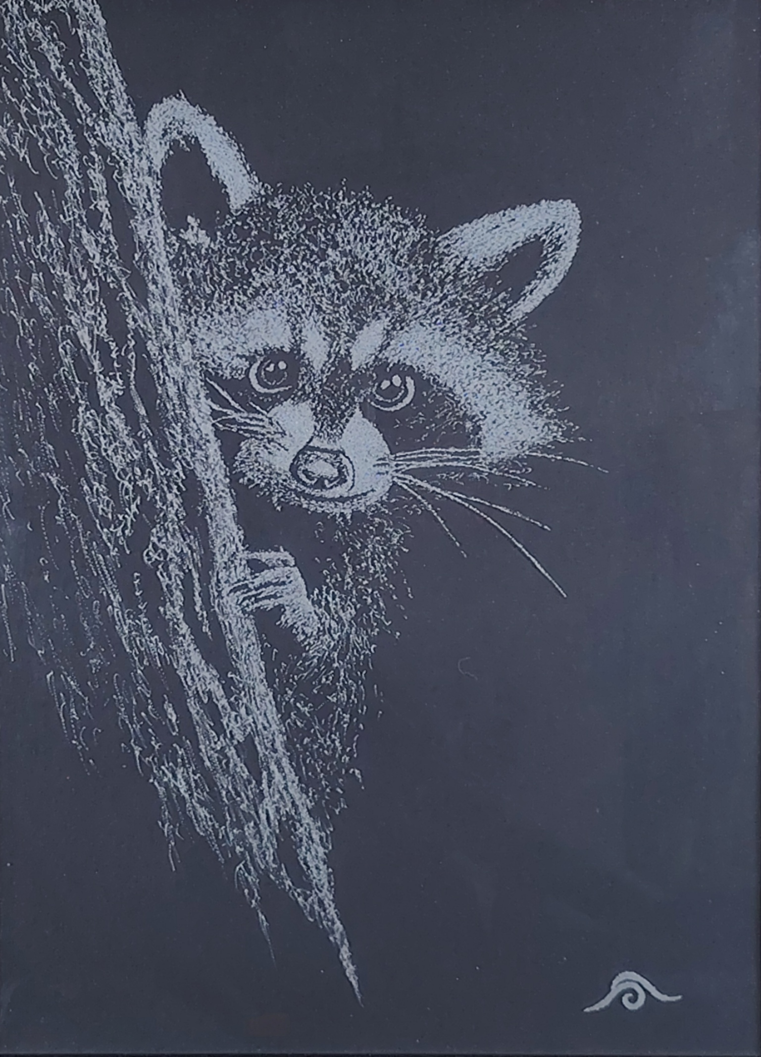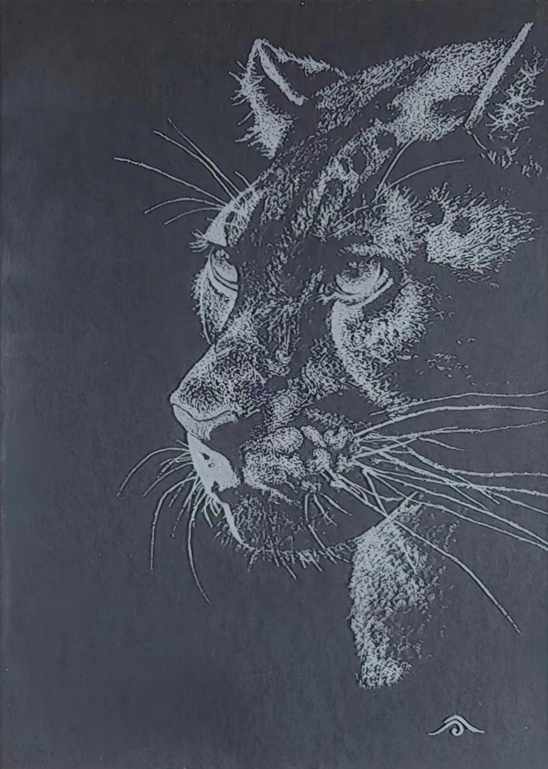 Avec une Dremel dans le tiroir, une envie soudaine me vient de la prendre en main et de graver le verre d’un cadre. Un cadre sous lequel je met un papier noir pour gagner un maximum de contraste. Pour pouvoir bien marquer et faire ressortir les valeurs, j’adopte le pointillisme en prenant ma plus grande patience pour graver chacun de ces points.