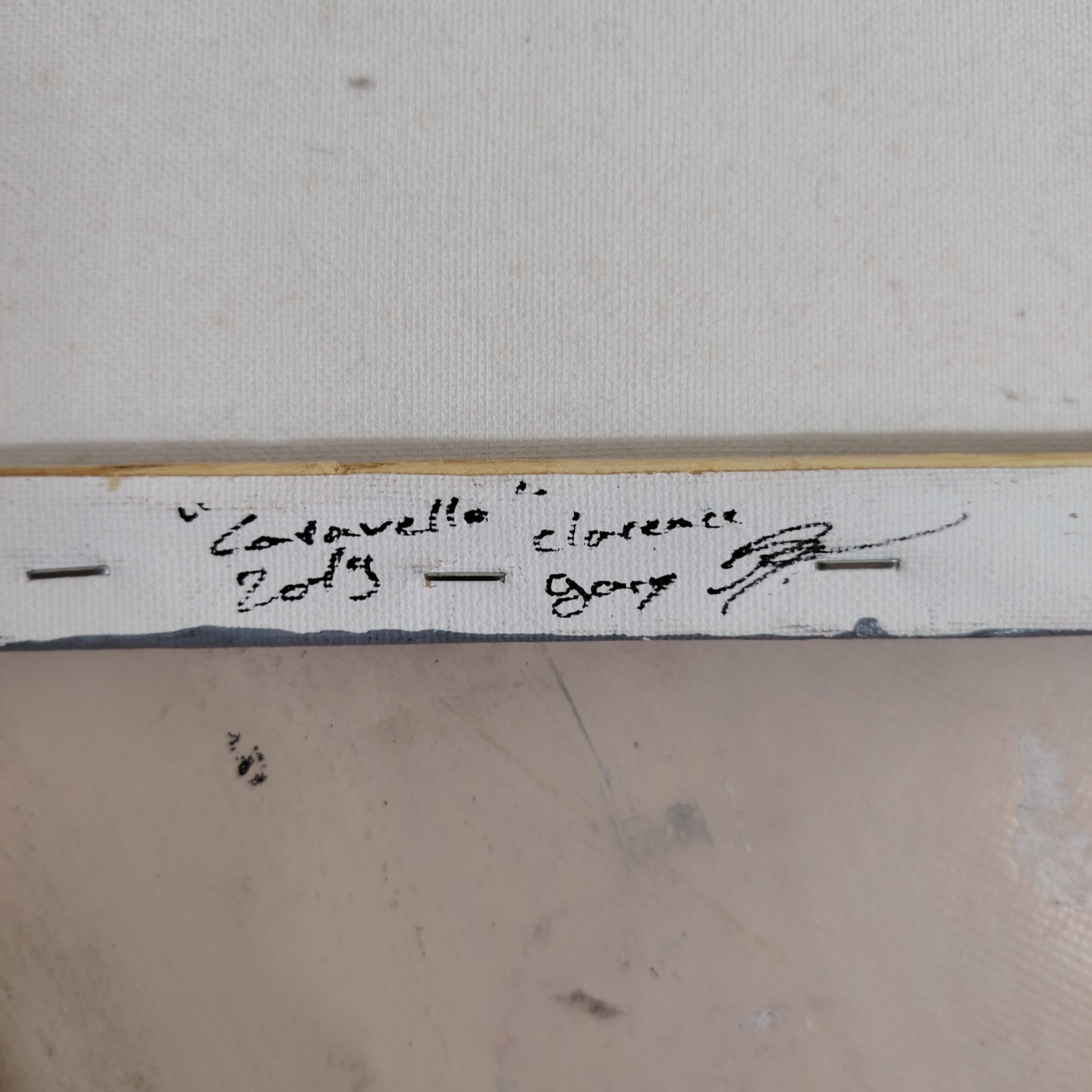 Réalisé au couteau en mars 2019 sur un châssis entoilé de 1,7 cm d’épaisseur et une toile 100% coton agrafée sur l’arrière.