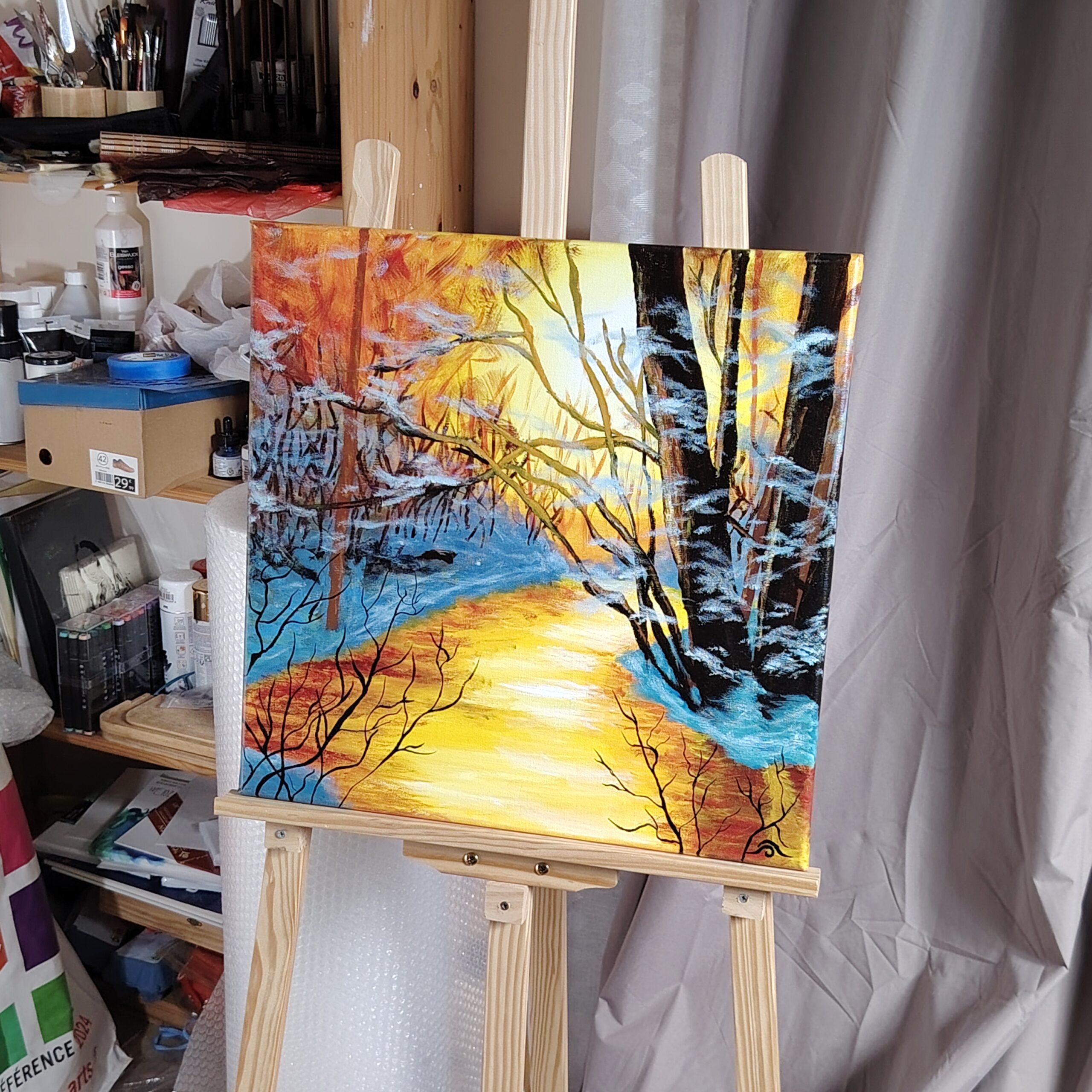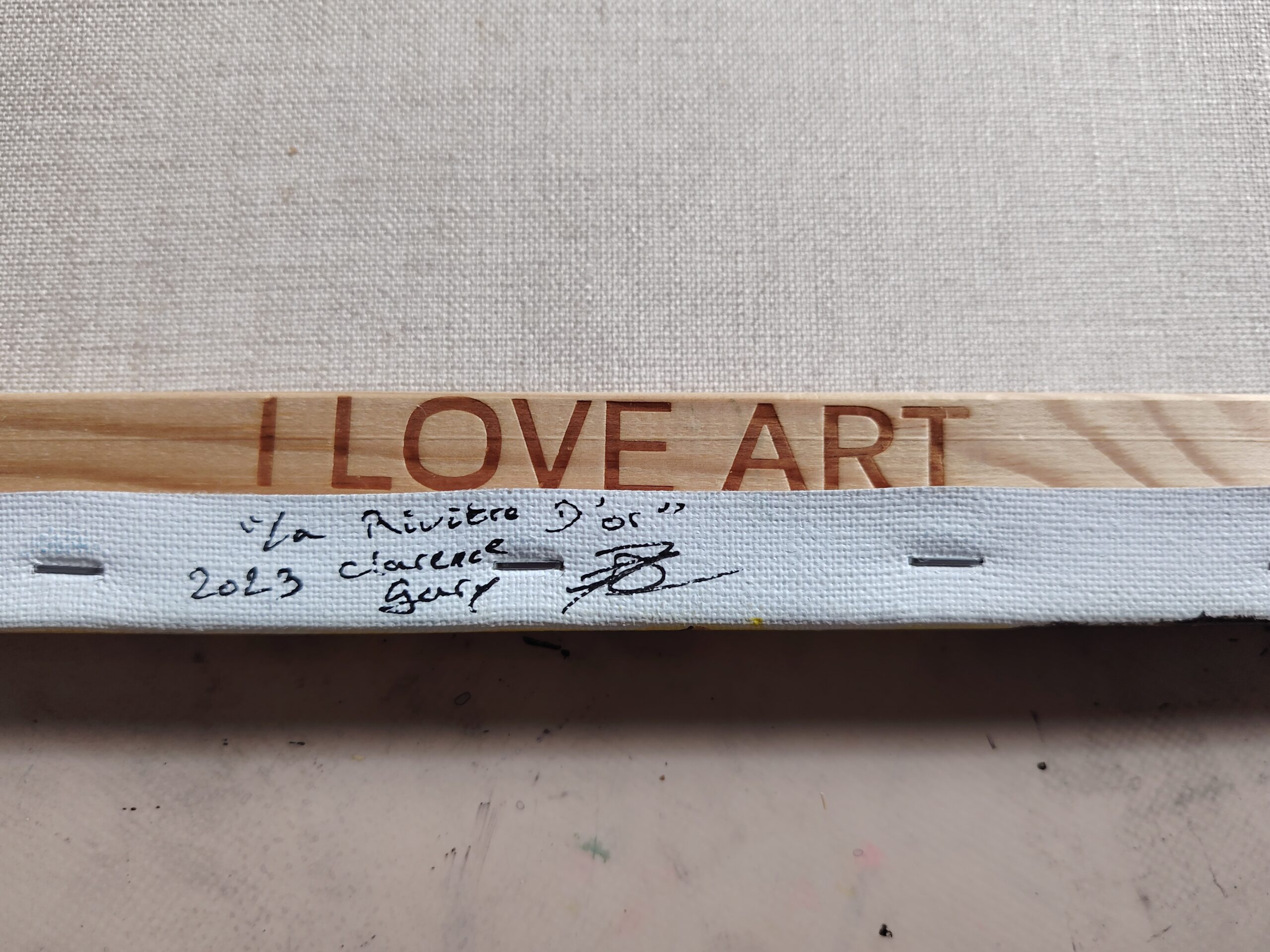 Réalisé au pinceau en janvier 2023 sur un châssis entoilé « I love Art » de 1,7 cm d’épaisseur et une toile 100% lin à grain moyen 400g/m² agrafée sur l’arrière.