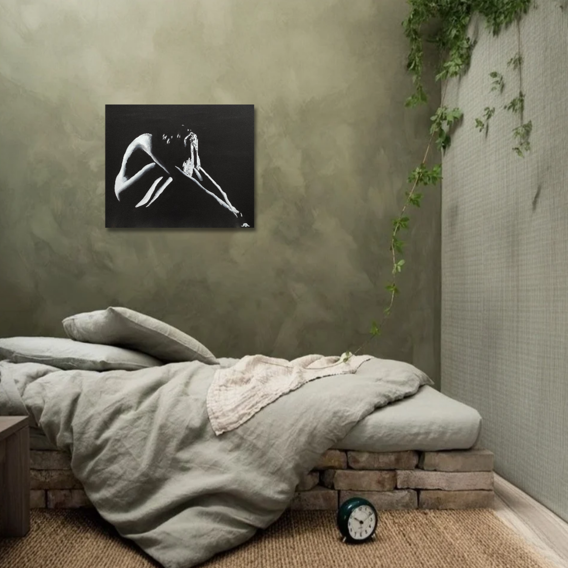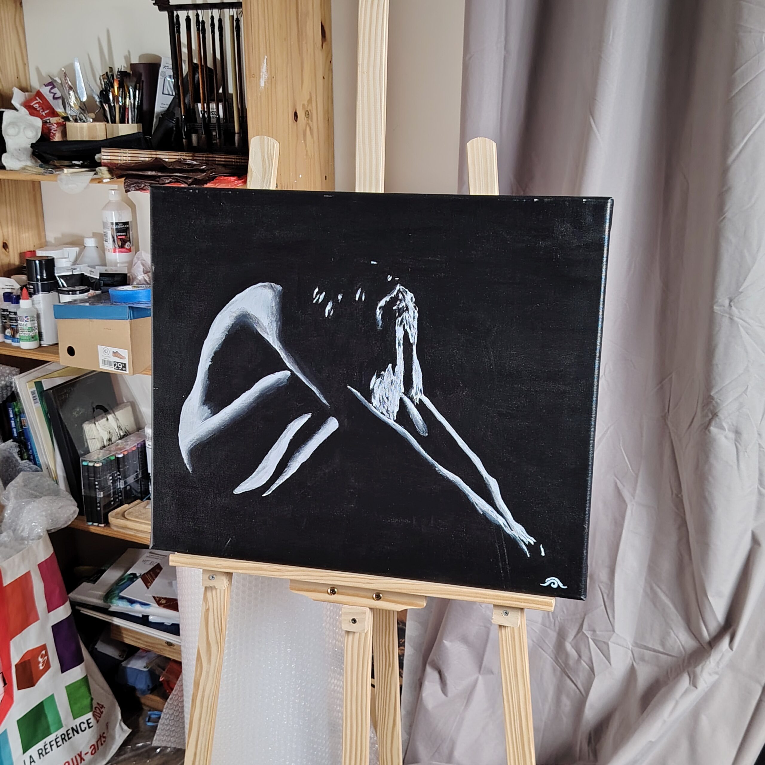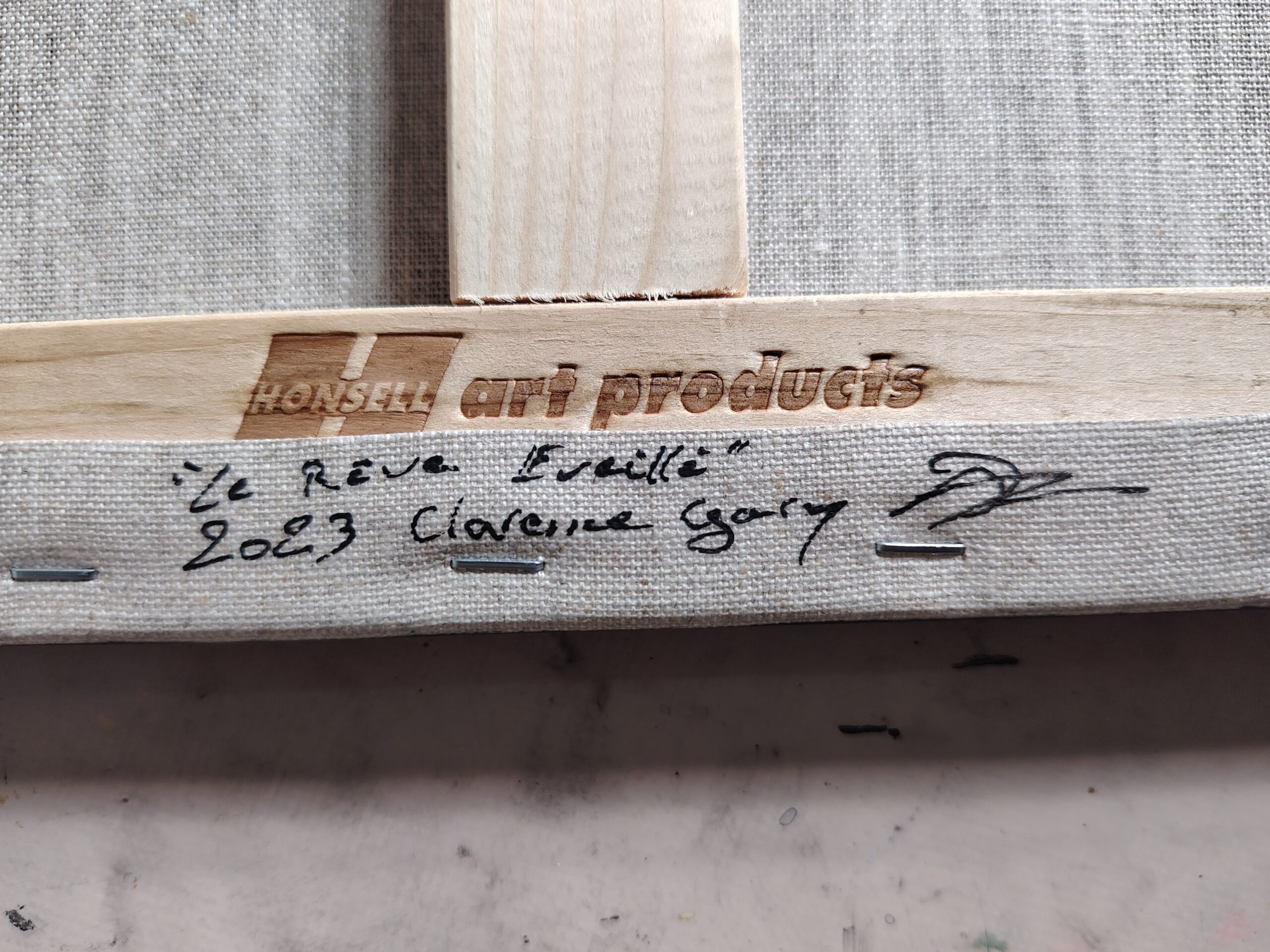 Réalisé au pinceau en décembre 2023 sur un châssis entoilé « Honsell » de 1,7 cm d’épaisseur et une toile 100% lin agrafée sur l’arrière.