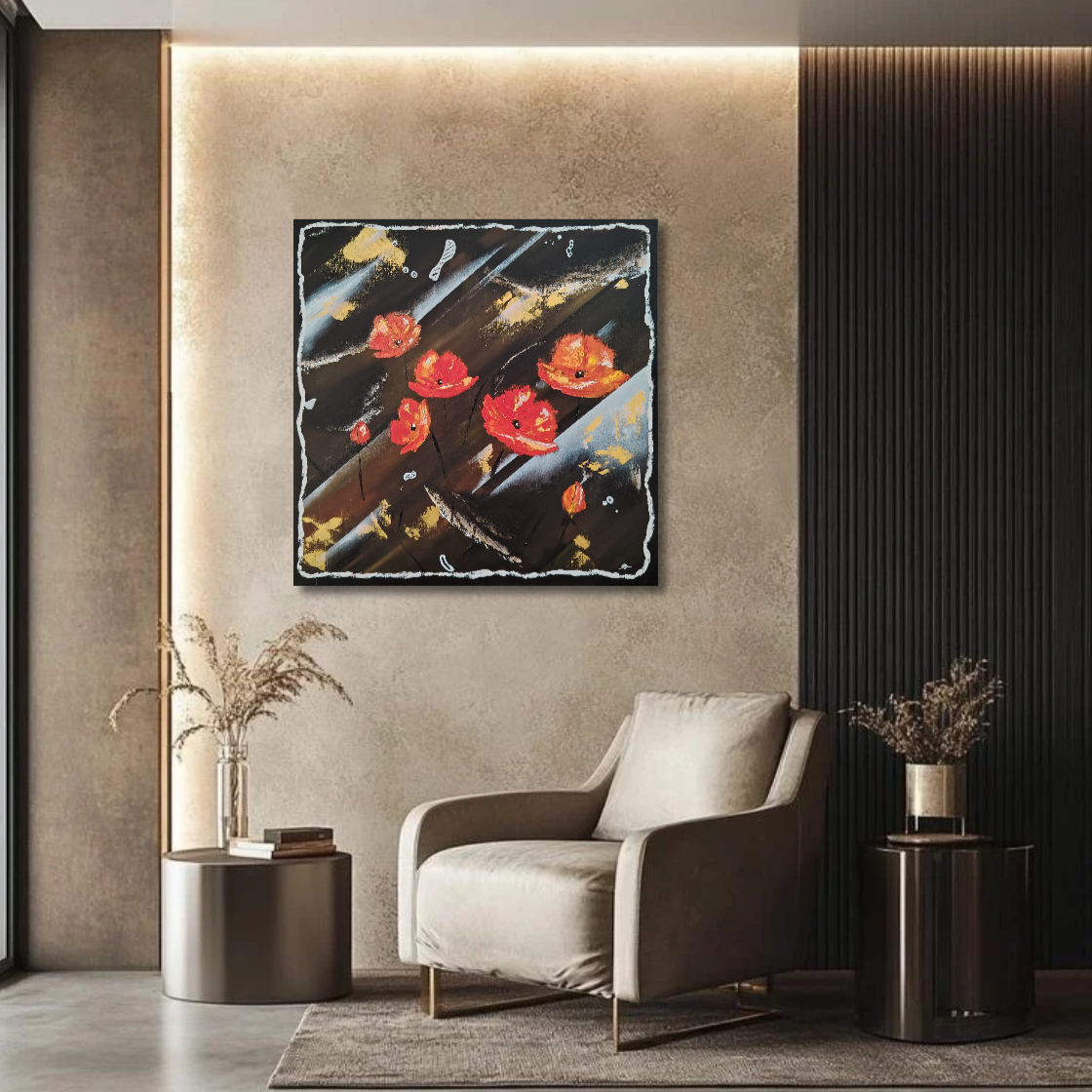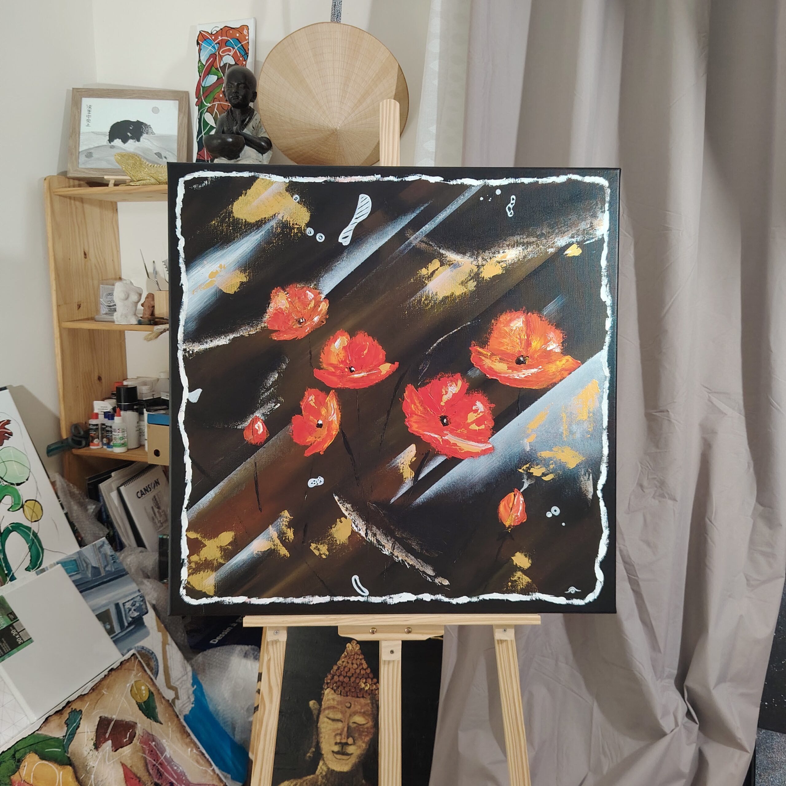 Ce magnifique tableau a été peint à la peinture acrylique extra-fine, avec une finition au vernis brillant, sur un grand format carré 80 x 80 cm.