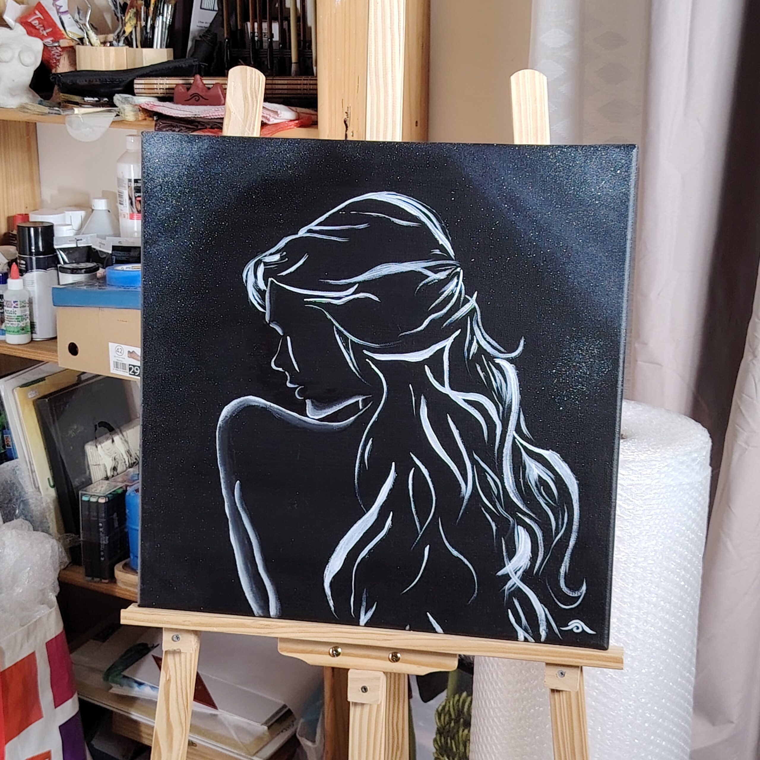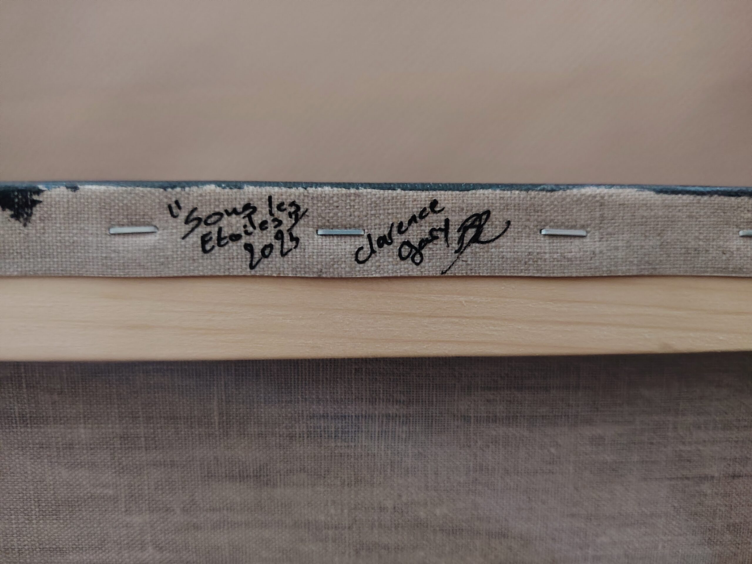 Réalisé au pinceau en septembre 2025 sur un châssis entoilé de 1,7 cm d’épaisseur et une toile 100% lin agrafée sur l’arrière.