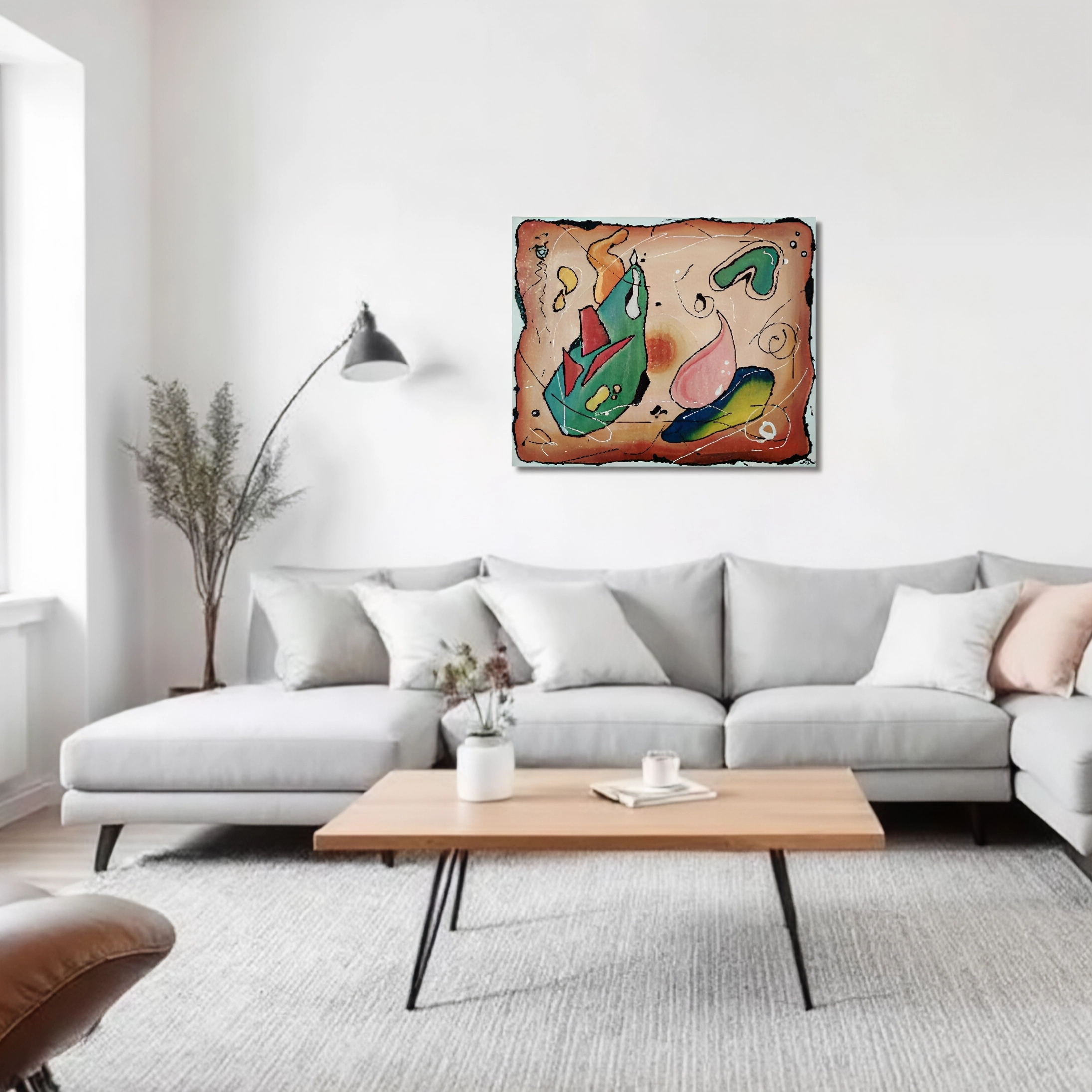 Ces peintures abstraites sont composées avec un contour peint en noir ou en blanc, ce qui ne vous impose pas un encadrement supplémentaire. Il est toutefois faisable d’y rajouter une caisse américaine pour un rendu élégant.