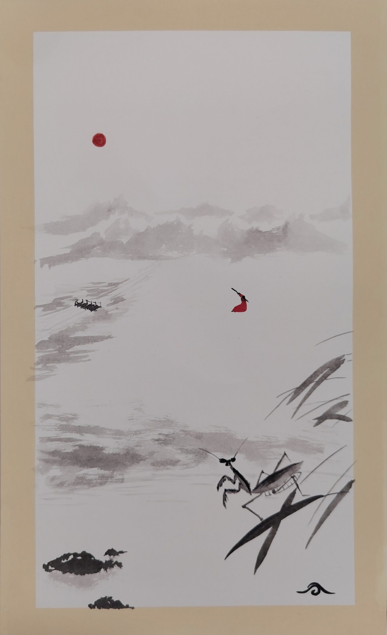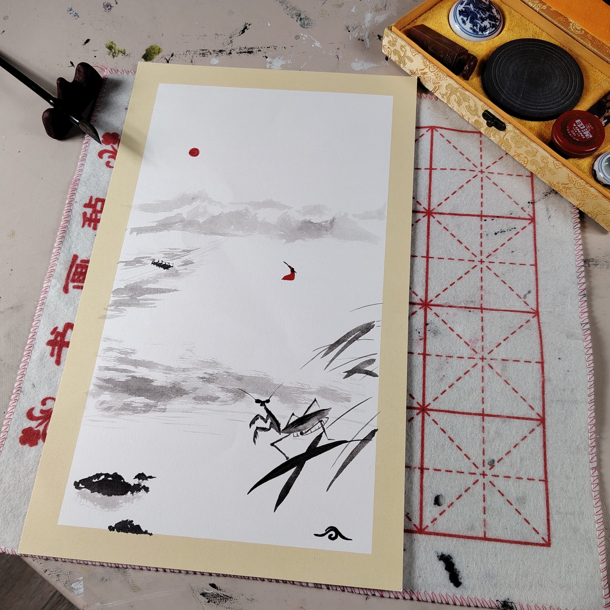 Réalisé au pinceau en poil de loup en octobre 2025 sur du papier de Xuan (feuille de riz) renforcé par l’arrière.